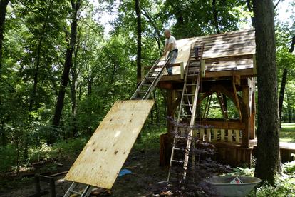 Plywood capped the oak surface for simulated slate shingles (used on all garden buildings and our home). While Gayle is afraid of heights, she battled through the fear to help.