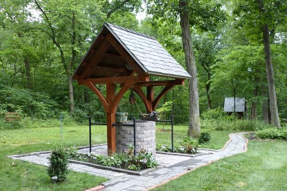 Any respectable well must have a well house. A two-post timber frame structure was erected in traditional raising fashion and roofed with simulated slate shingles, (as employed on all garden building structures, as well as the house).